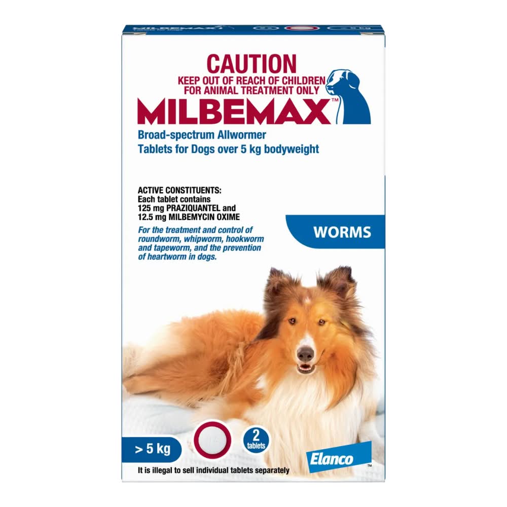 Milbemax is a veterinary grade animal health brand owned by Elanco that provides comprehensive protection against internal parasites in dogs. The product range features small unflavoured tablets designed to treat and control all major intestinal worms including roundworm, hookworm, whipworm, and tapeworm.