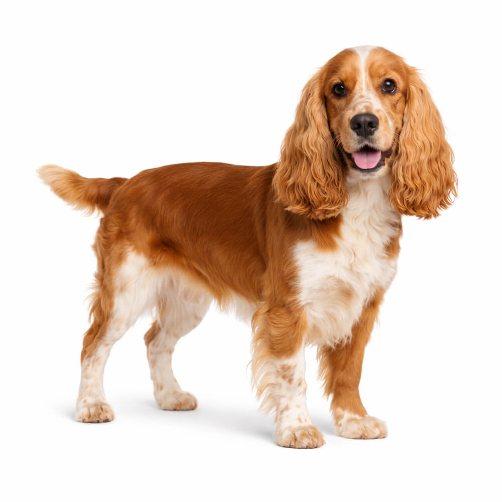 The English Cocker Spaniel is a medium-sized gundog from the United Kingdom, bred to flush and retrieve game in dense cover. They're athletic, affectionate, and merry by nature — one of the most versatile spaniel breeds and a consistently popular choice in Australia.