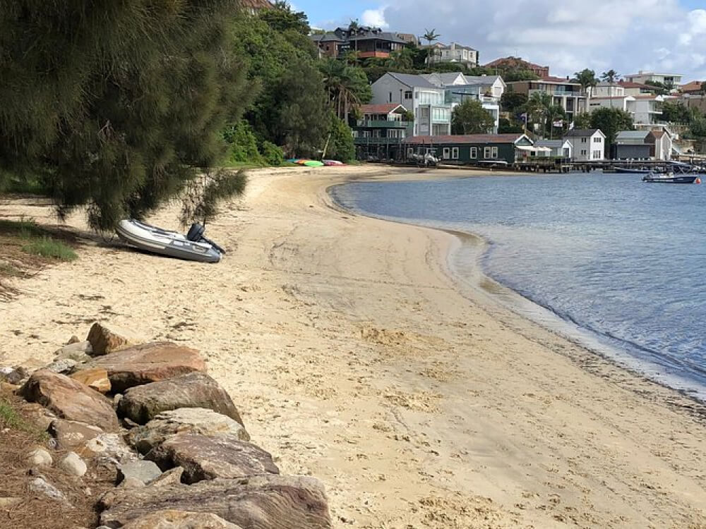 The quieter alternative to Rose Bay Dog Beach, tucked between the Rose Bay and Point Piper marinas. It's a small, sheltered harbour cove — about 230 metres of sand backed by Rose Bay Park's shady grass slope. Calm, shallow water, kayak and SUP hire at the far end, and a fraction of the crowds. Dogs are officially on-lead, though enforcement is light and you'll regularly see dogs splashing freely.