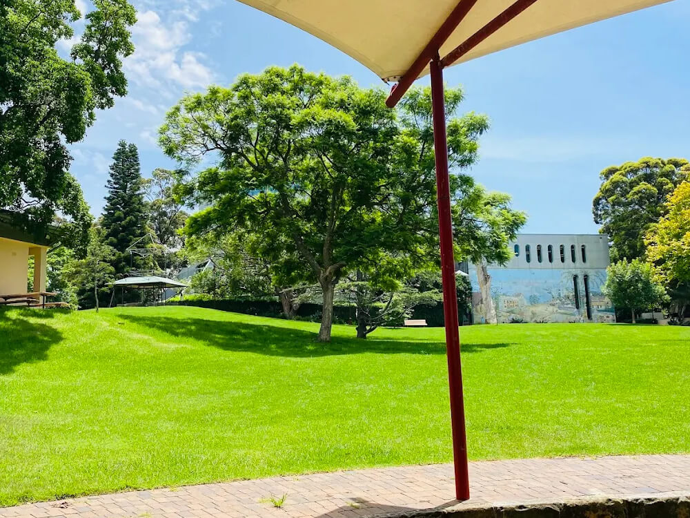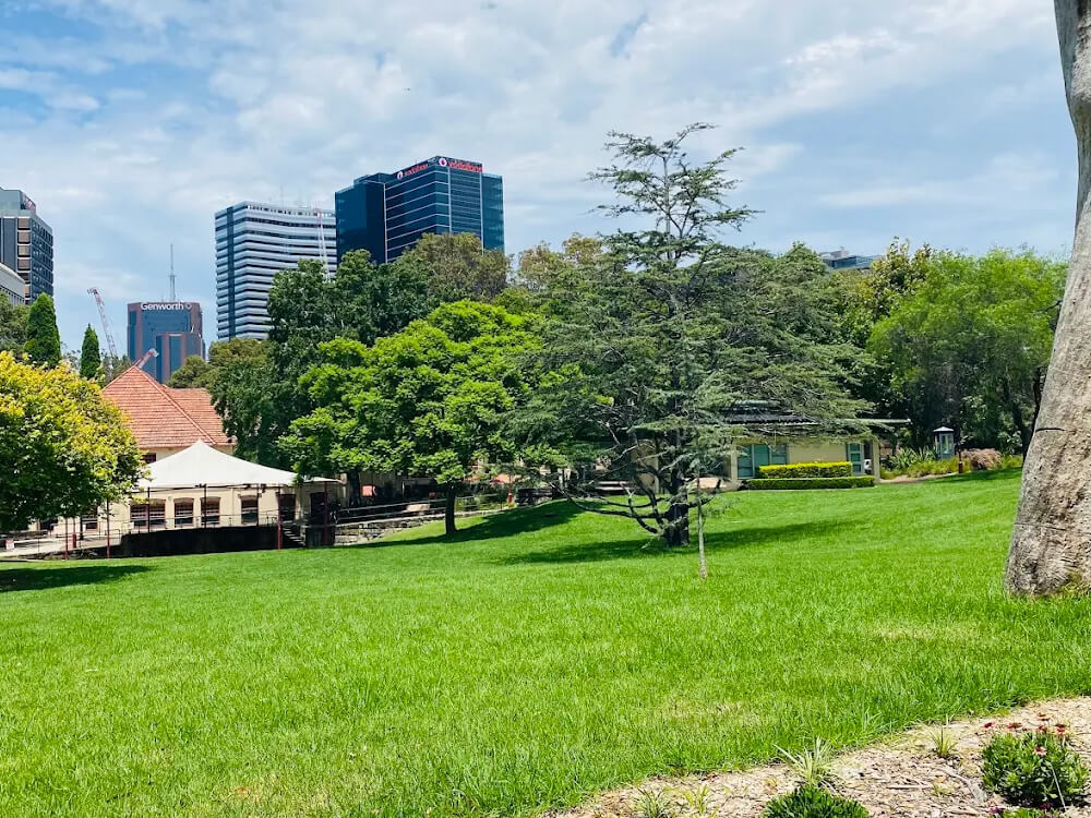 Ted Mack Civic Park unfolds across rolling lawns beneath mature specimen trees in the heart of North Sydney's civic precinct on Miller Street, bordered by Stanton Library, Council Chambers, and the North Sydney Community Centre. The well-maintained pathways and generous open space make it an inviting off-leash destination for dogs and a social hub for the broader community throughout the week.