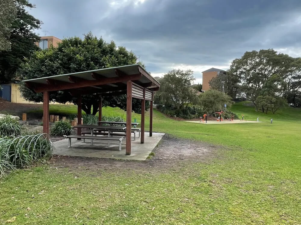 The park includes a children’s playground (swings, rockers, climbing structure), a modern outdoor gym, picnic shelters, seating and trees.