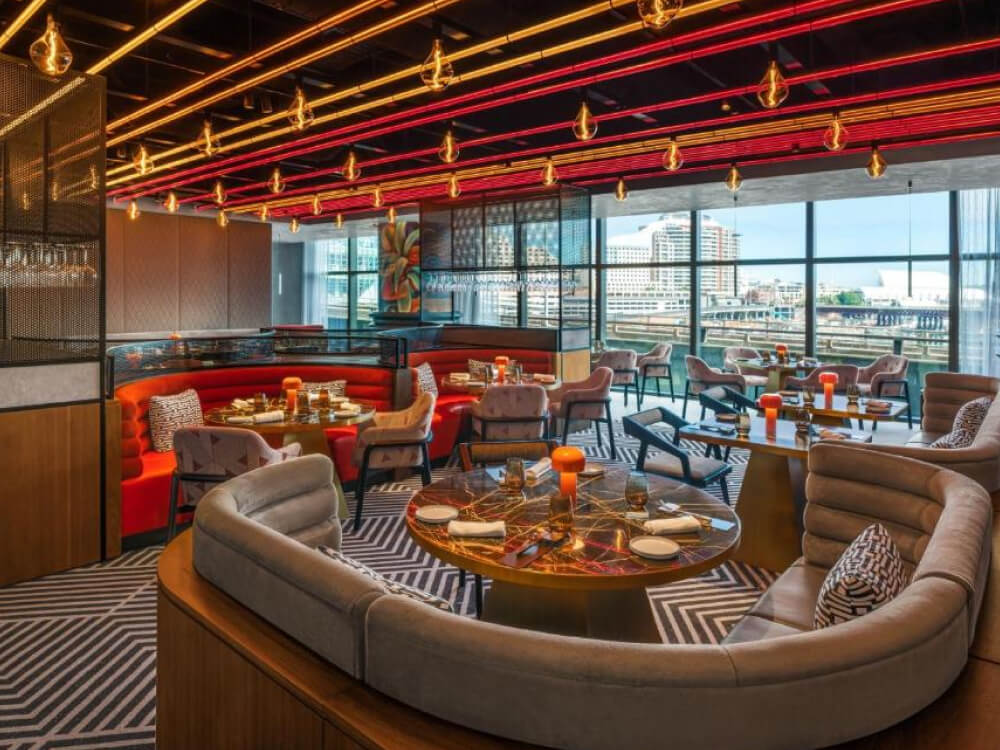 Perched on the edge of Darling Harbour with sweeping harbour views, the hotel's design leans hard into contemporary spectacle: sweeping curves, vivid interiors, four dining and bar venues, and a rooftop infinity pool with cabanas. Dogs are welcomed through the W Hotels PAW (Pets Are Welcome) program, with a custom pet bed, food and water bowls, waste bags, and a "Pet In Residence" door hanger set up in the room before you arrive.