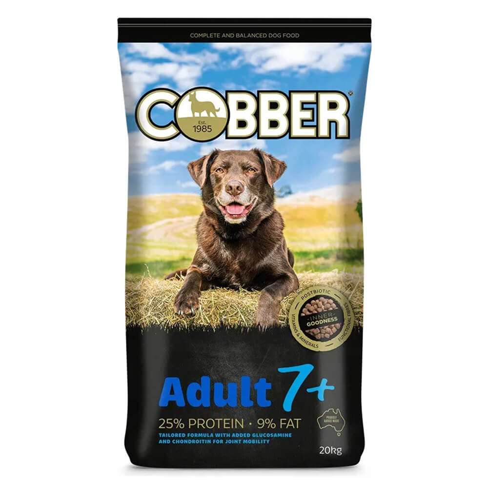 Cobber Adult 7+ is a dry dog food designed for senior dogs aged seven years and older. The formula shifts focus toward the specific needs of ageing dogs, with an emphasis on joint support and cognitive function — two areas where older dogs commonly need nutritional assistance.