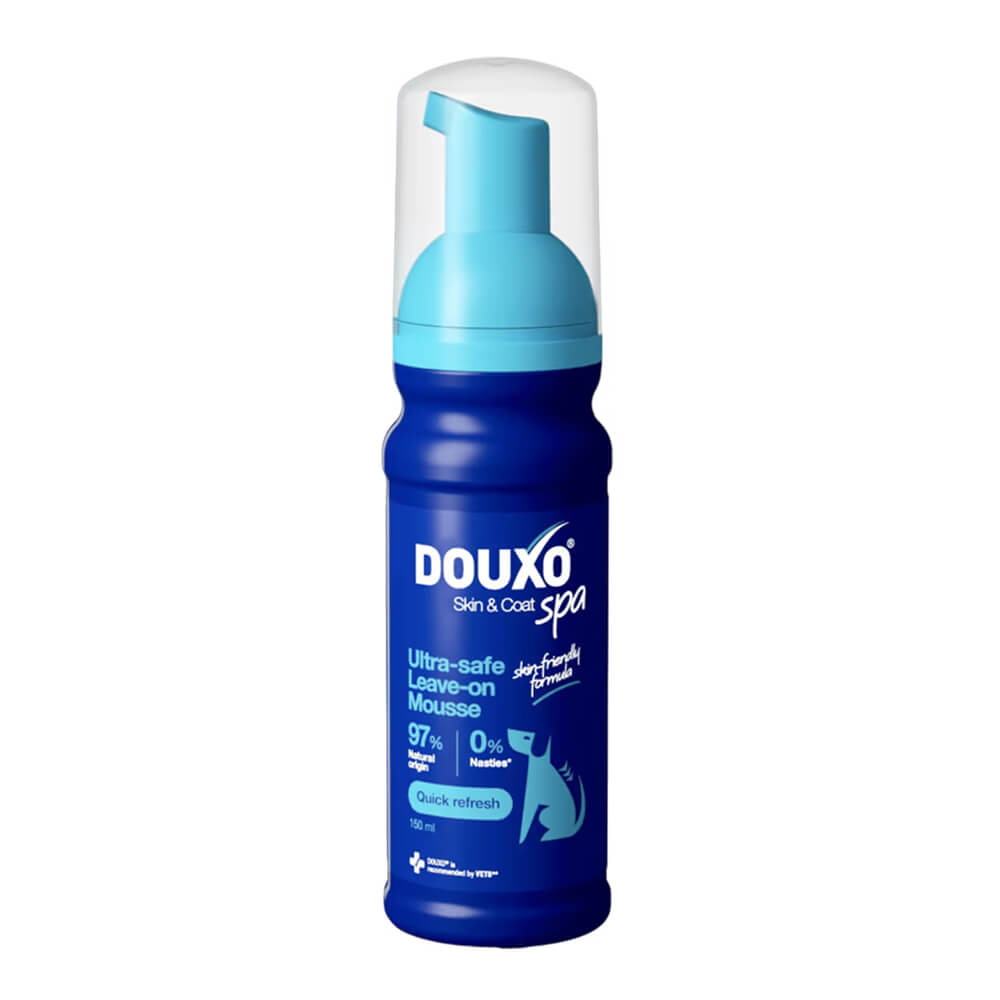 DOUXO SPA Quick Refresh Dog Mousse is a no-rinse, leave-on grooming mousse from the DOUXO SPA range by Ceva Animal Health, formulated for waterless coat cleansing and conditioning between baths. Hydrolysed sweet almond protein is the lead conditioning agent, providing moisture retention and coat softness. Ophiopogon japonicus root extract and provitamin B5 (panthenol) contribute skin-barrier support.