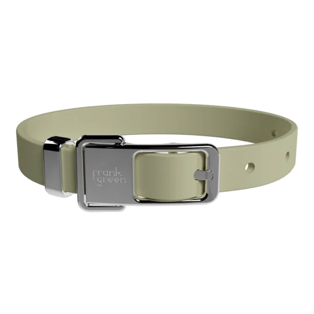 Frank Green Pet Collar is a dog collar constructed from reinforced webbing with a flexible poly-coating, zinc alloy adjustable hardware, and a solid stainless steel D-ring. Adjustable, waterproof, and easy to clean. Designed to work with the full range of frank green collar add-ons — including the Pet Name Tag, Pet Safety Light, and Apple AirTag® Holder — which all thread onto the collar strap via a rear silicone buckle. Available in small, medium, and large.