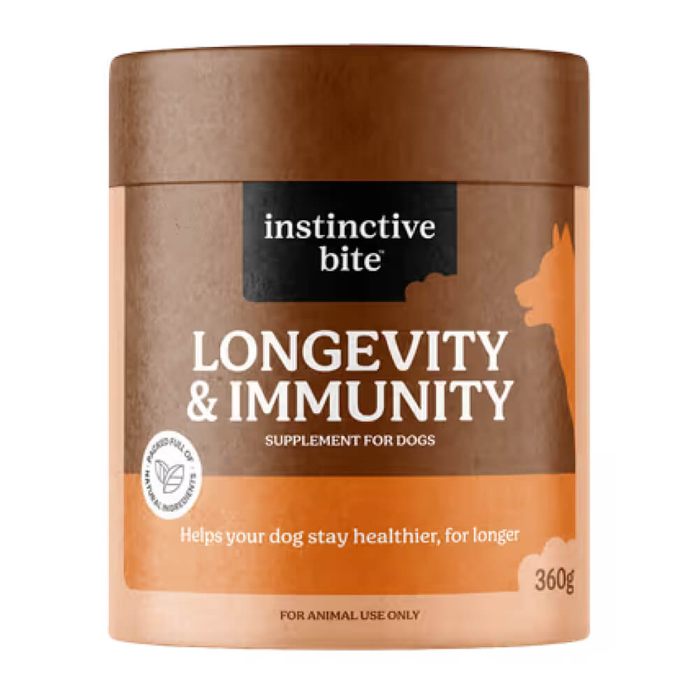 Instinctive Bite Longevity and Immunity Support is a supplement powder for dogs, formulated to support long-term immune health and overall vitality.