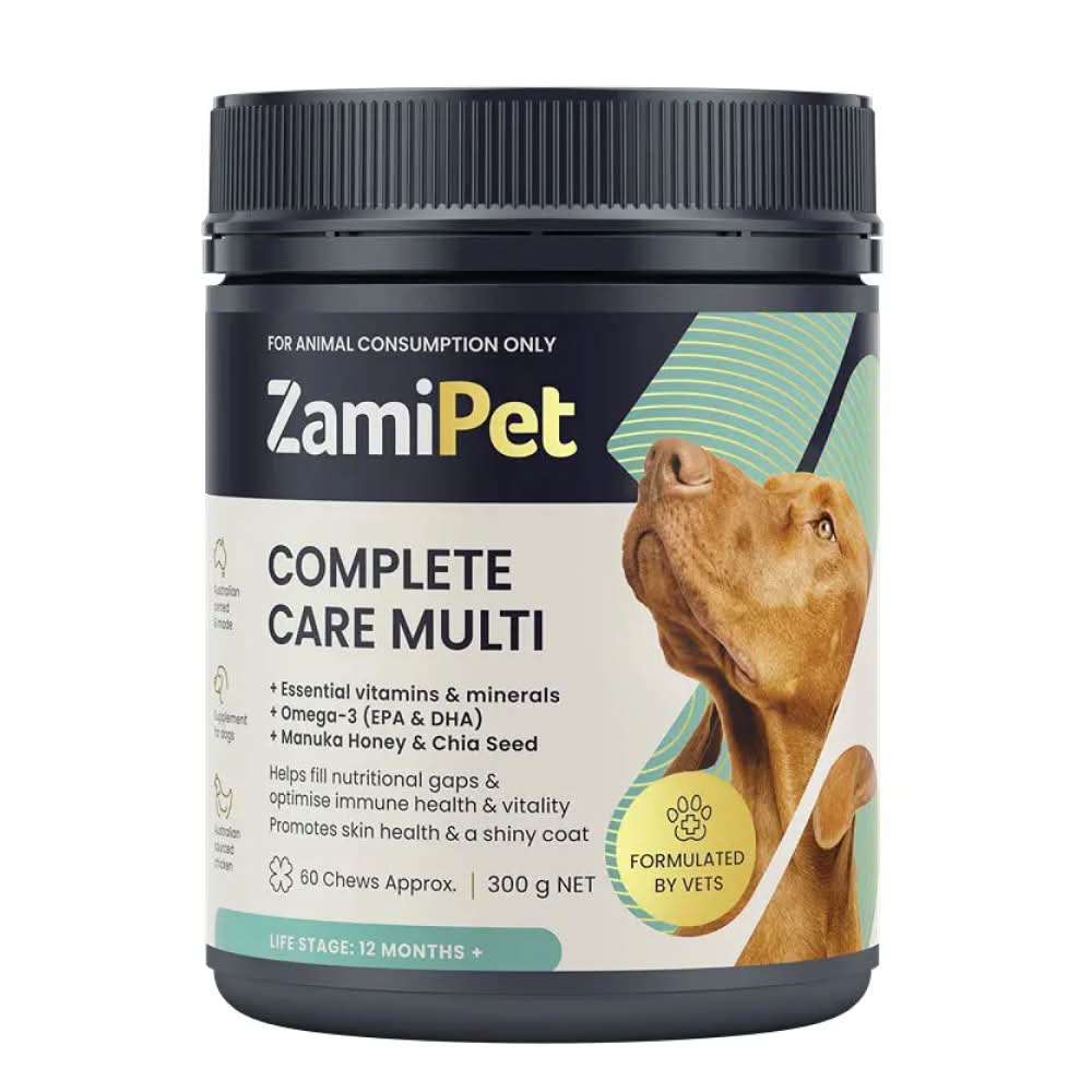 ZamiPet Complete Care Multi for Dogs is a chewable multivitamin supplement for dogs formulated to support overall health and vitality.