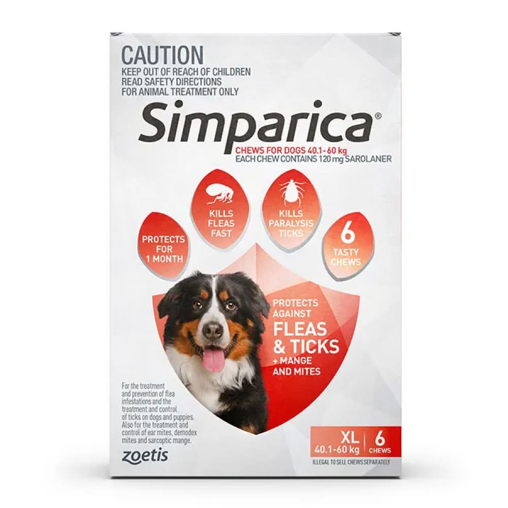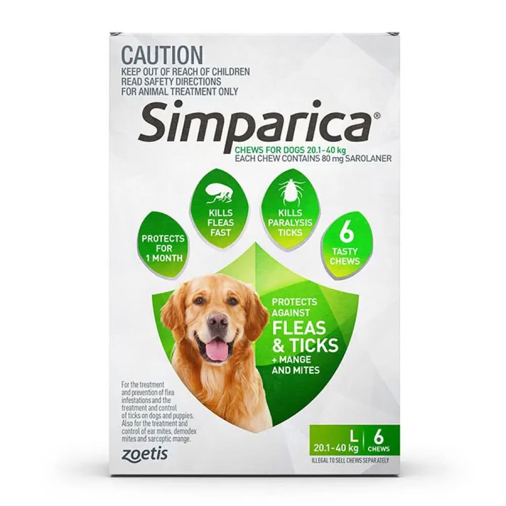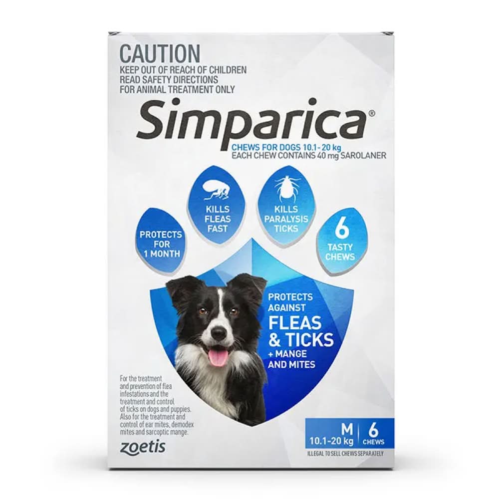 Simparica provides fast acting monthly protection against fleas, paralysis ticks, and mites in a single highly palatable chew.